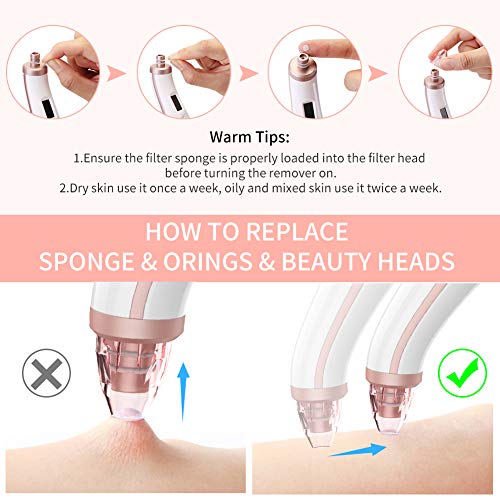 El removedor de puntos negros tiene 3 cabezales de limpieza reemplazables para satisfacer diferentes necesidades. El eliminador de espinillas tiene 3 fuerzas de succión diferentes que pueden ajustarse y puede elegir la intensidad según sea necesario. La pantalla LCD puede mostrar el tiempo de trabajo, la potencia de succión y la carga restante de la batería.